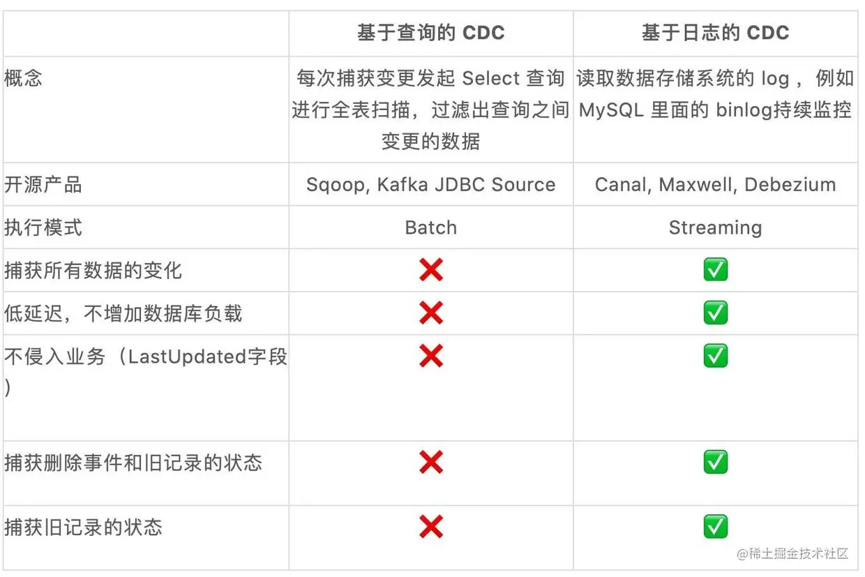 CDC 全称是 Change Data Capture ,它是一个比较广义的概念,只要能捕获变更的数据,我们都可以称为 CDC 。业界主要有基于查询的 CDC 和基于日志的 CDC ,可以从下面表格对比他们功能和差异点。