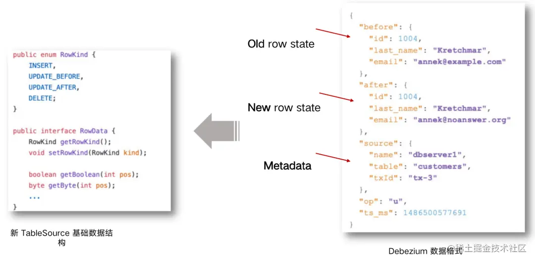重构后的 TableSource 输出的都是 RowData 数据结构,代表了一行的数据。在RowData 上面会有一个元数据的信息,我们称为 RowKind 。RowKind 里面包括了插入、更新前、更新后、删除,这样和数据库里面的 binlog 概念十分类似。通过 Debezium 采集的 JSON 格式,包含了旧数据和新数据行以及原数据信息,op 的 u表示是 update 更新操作标识符,ts_ms 表示同步的时间戳。因此,对接 Debezium JSON 的数据,其实就是将这种原始的 JSON 数据转换成 Flink 认识的 RowData。