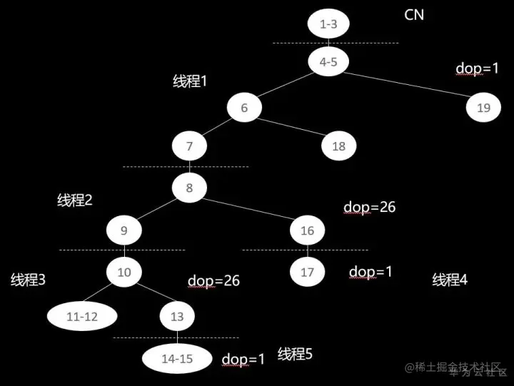 通过将performance信息转变为计划树,可以得到该计划的计划树如下图所示:其中1-3号算子在CN上执行,DN上以跨线程数据传输的Stream算子进行分隔,一共会启动5个线程。GaussDB(DWS)采用pipeline的迭代执行模式,线程4和5从磁盘读取数据,其它每个Stream算子分隔的线程从子线程读取数据,进行执行,并将结果返回给上层算子,顶层DN线程将数据返回给CN处理。通过这个图,我们可以看出,线程1,4,5采用的并行度是1,而线程2,3采用的并行度是26。通过计划信息,我们可以看出,8-13号算子处理的数据量较大,刚好是线程2,3处理的范围,所以选择了较高的并行度。