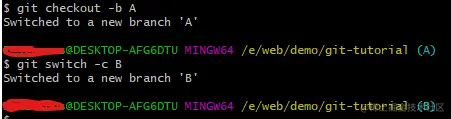 实际上相当于连续执行git branch Agit checkout A/git branch Bgit switch B执行git checkout/switch -:切换回上一个分支 (一直执行就会在最近两个分支行中不停切换) -