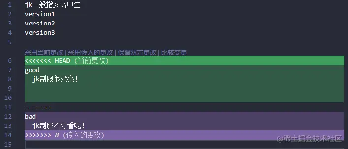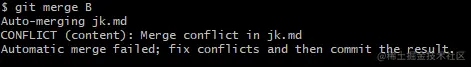 这时,系统告诉我们jk.md文件发生了冲突(Conflict)。可以打开jk.md文件如下: