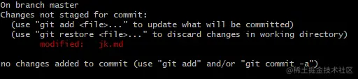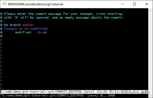git commit -m 'jk':保存仓库的历史记录 执行git commit -m 'jk'(记述一行提交信息)后再执行git status: