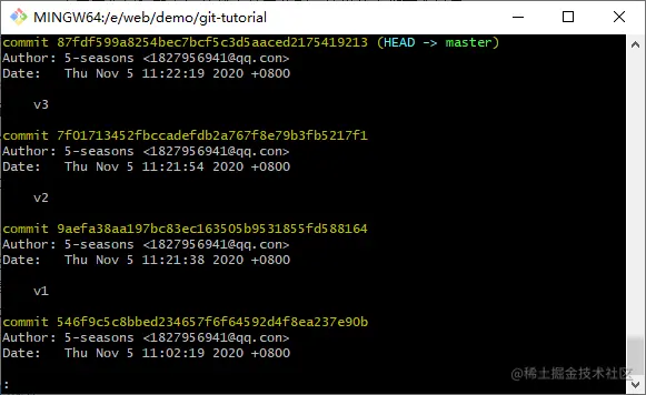 git log:查看提交日志 例如:第一次修改写入v1,commit;第二次修改写入v2,commit;第三次修改写入v3,commit。- 执行