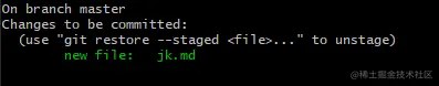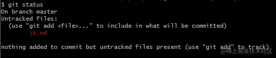 执行git add jk.md命令后,没有任何显示,这就对了,Unix的哲学是“没有消息就是好消息”,说明添加成功。再执行git status: