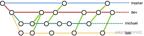 - 你和你的小伙伴们每个人都在dev分支上干活,每个人都有自己的分支,时不时地往dev分支上合并就可以了。