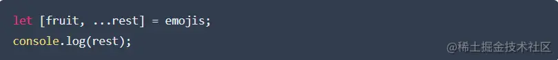 再介绍一下rest操作符。如果要对数组进行解构,以便要将一个或多个项目分配给变量,并将其余部分放在另一个数组中,就可以使用如下所示的...rest方法完成此操作。