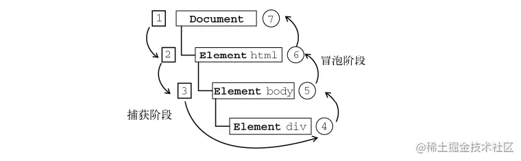 - 事件捕获:最外层元素先接收事件,沿着DOM树至最具体的元素最后接收