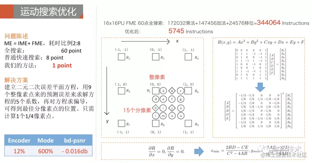 进入决策模块的内部,同样存在大量复杂的计算。帧内预测存在35种模式,我们可以通过贝叶斯理论,求出最简单的几种模式后,估计出最佳模式最可能出现的位置,从而为帧内模式筛选过程提升一倍速度并将损失控制在0.01db。另外,帧间预测的运动搜索是从参考帧寻找最佳匹配块的过程,它的分像素搜索需要做7抽头或者8抽头的插值滤波,计算量很大。我们所以可以利用整像素的信息建立二元二次误差平面方程,估算最佳分像素点的位置,避免了分像素的完整搜索过程。