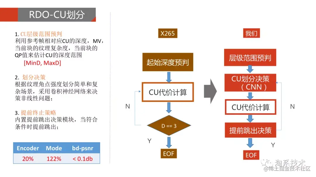 所以在RDO中,减少CU划分层级的搜索次数,筛选出一些必要的层级是减少计算量的重要手段。首先利用时间和空间相关性,可以从参考块获取到一些先验信息,再结合本块的运动信息和纹理信息,分析预判出当前块CU层级的最大估计层级和最小估计层级。其次,在决策过程中的提前跳出策略也可以大幅降低计算量,我们根据图像纹理的平坦程度,或者各种模式下的rdcost对比,提前跳出当前的模式遍历。而在一些图像非线性的场景,我们通过CNN深度学习模型辅助决策模式。
