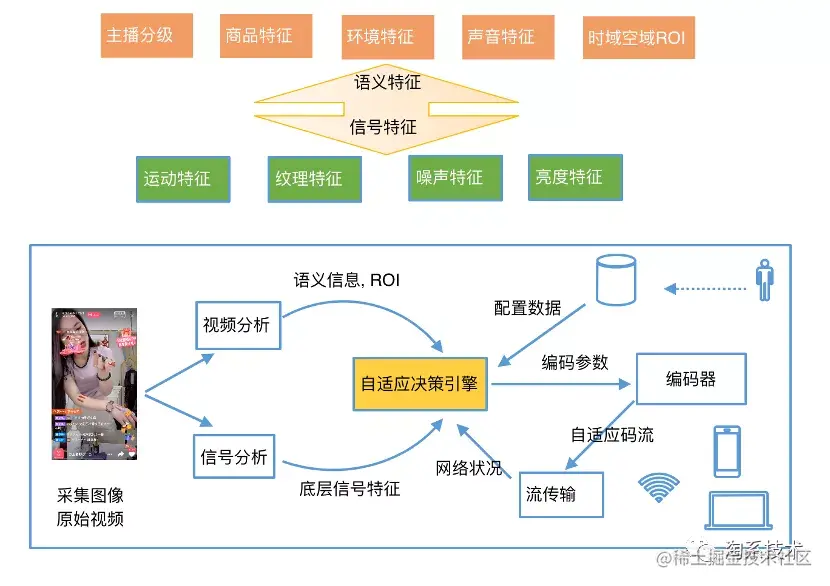 在此需求下,我们提出了基于不同场景的编码参数配置策略。首先,我们通过多个深度学习与机器学习模型对数万条各种内容的直播视频进行了数据训练分类,包含两个大的特征维度,分别是语义特征和信号特征。语义特征包含:主播分级,商品特征,环境特征,声音特征,时域空域RoI。信号特征包含:运动特征,纹理特征,噪声特征,亮度特征。通过对不同特征种类的视频集,我们单独使用大规模服务器集进行最佳编码参数搜索,自动化高效地搜索到适合当前视频编码的最佳编码参数组合,在提升画质的同时能尽可能地减少码率消耗。并最终根据编码参数集进行聚类分为多个参数配置项。