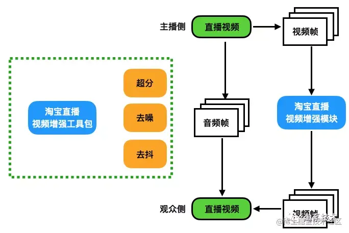 在淘宝直播的场景中,大主播有自己的专业设备与团队,直播出来的视频与音频都是比较高质量的。但是针对中小主播,用户的行为不可控。因此产生的结果就是很多中小主播产生的视频质量比较低,收获的观众数量也比较少。针对这种情况,我们选取了用户习惯产生最严重的几种情况,对这一类主播进行了画质增加的,显著提升了用户的直播体验。