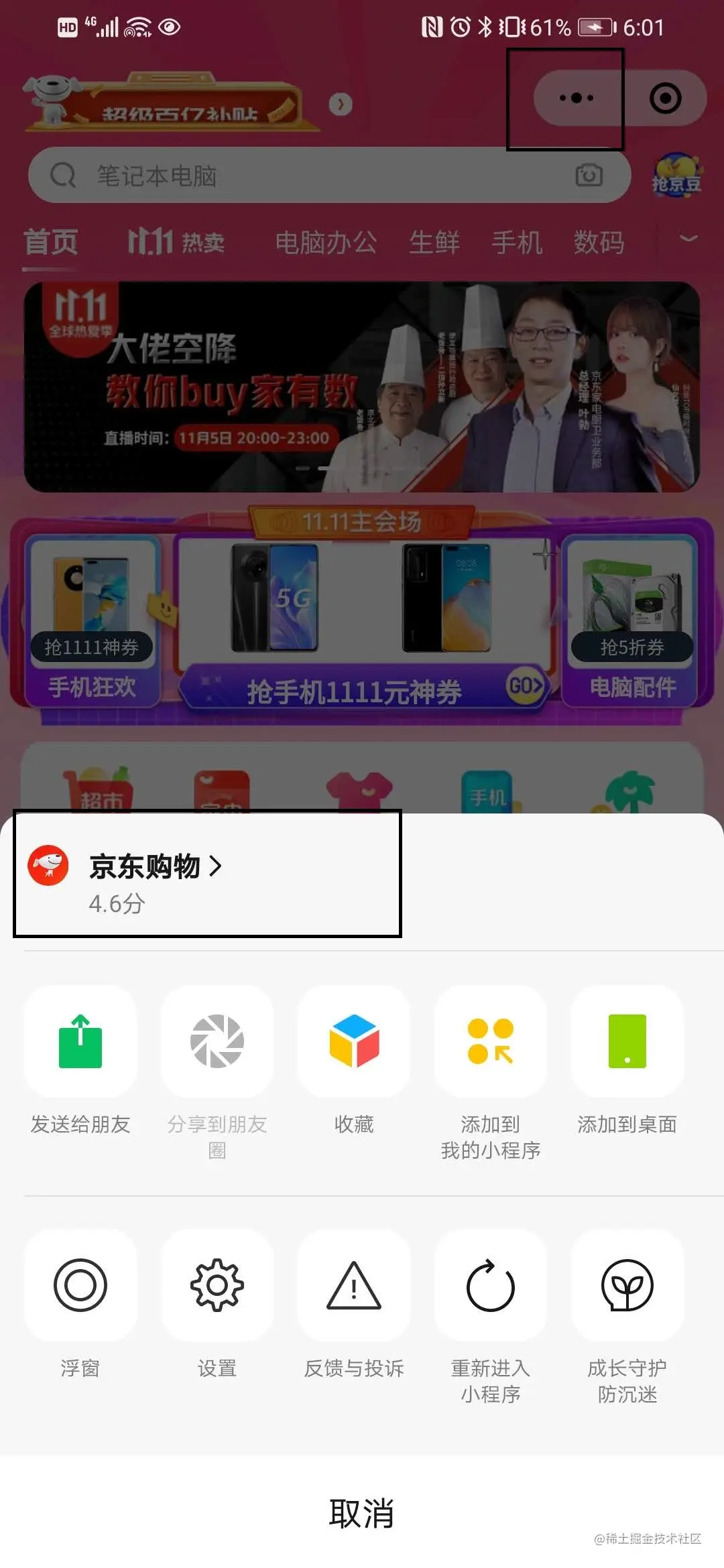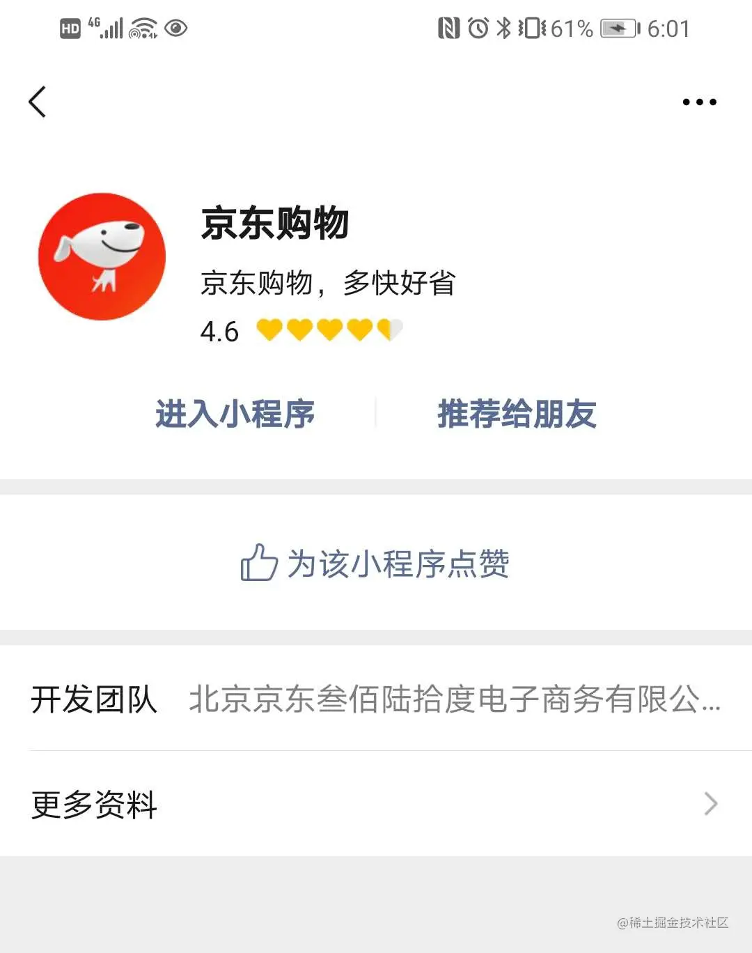 点击右上角悬浮按钮,然后在弹出框中点击京东购物,进入小程序详情简介页面