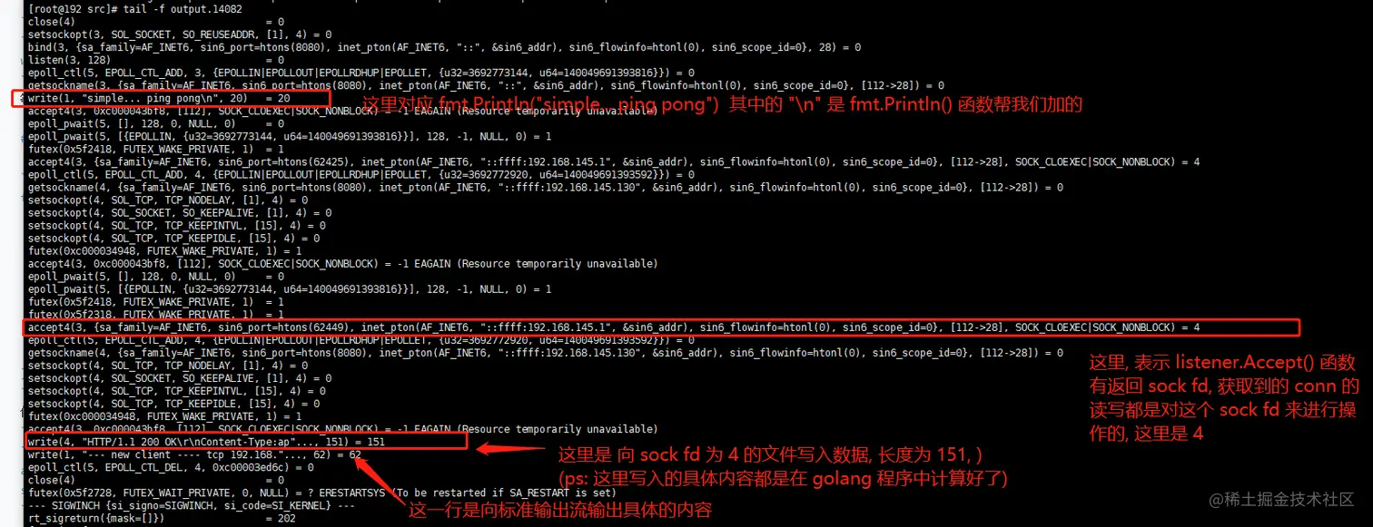 bind(3, {sa_family=AF_INET6, sin6_port=htons(8080), inet_pton(AF_INET6, "::", &sin6_addr), sin6_flowinfo=htonl(0), sin6_scope_id=0}, 28) = 0 把 8080 端口和 3 绑定起来了, 8080 是程序监听的端口信息, 3 是 sock 的文件描述信息