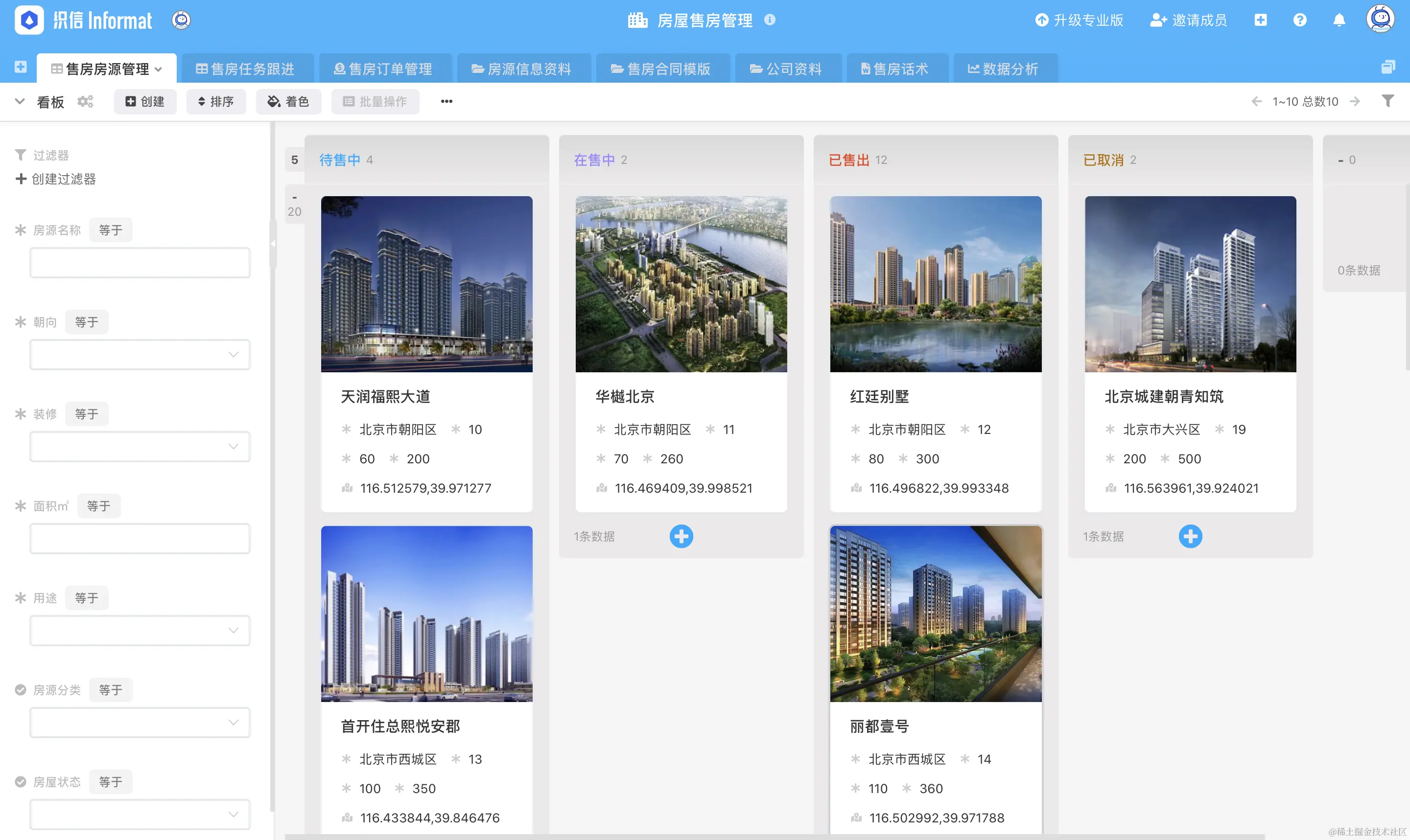 在售房管理系统的设计中,贯穿营销绩效最大化、品牌价值最大化、客户价值最大化三位一体的管理理念,利用织信在线低代码开发平台,整合oa办公自动化应用、消息机制、预警机制、知识管理等管理思想与开发技术。借助售房管理系统,房地产企业可以整合营销、销售、客服、物业等各部门资源,实现客户信息与内部资源的共享与价值最大化,提升企业核心竞争能力。