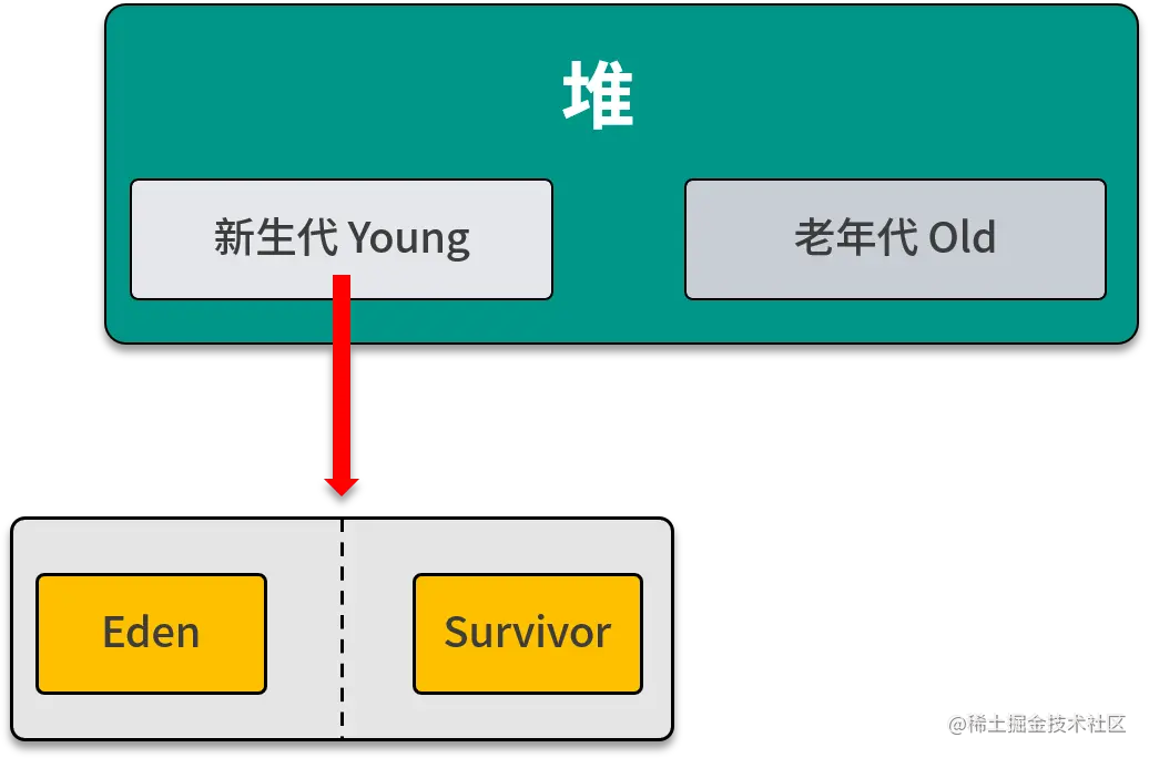 按照对象存储时间的不同,堆中的内存可以划分为新生代(Young)和老年代(Old),其中新生代又被划分为 Eden 和 Survivor 区。具体如下图所示: