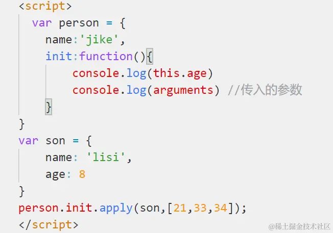 2、apply方法(第一个参数是指向的对象,第二个参数是一个数组)
