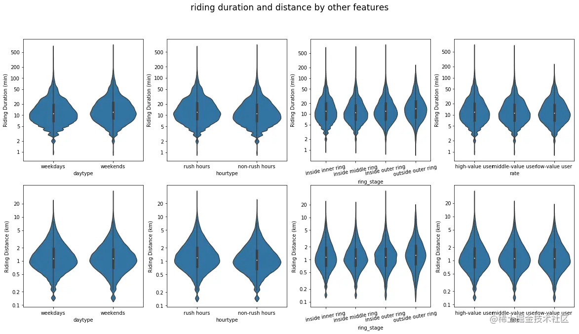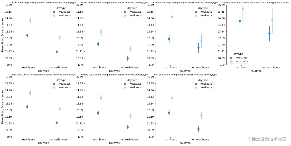 - 总体上,除了内环以内的数据外,其他区域的平均骑行时长均随着骑行起点离市中心越远而变得越高