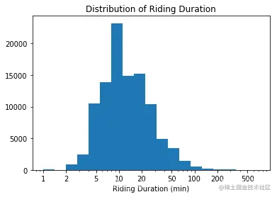 骑行时长的数据范围非常大,最小值为1分钟,最大值为666分钟,且呈现长尾分布,绝大多数骑行时长较短,使用log转换x轴绘图可以发现,骑行时长呈现右偏态分布,峰值出现在7-10分钟之间。