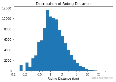 数据集中的骑行距离用的是骑行始末点之间的直线距离作为估算的,该数据的范围同样非常大,最小值为0.146km,最大值为32.497km,且同样呈现长尾分布,绝大多数骑行距离较短,极少数骑行距离较长,使用log转换x轴绘图可以发现,骑行距离呈现右偏态分布,峰值出现在0.7-1.3公里之间。