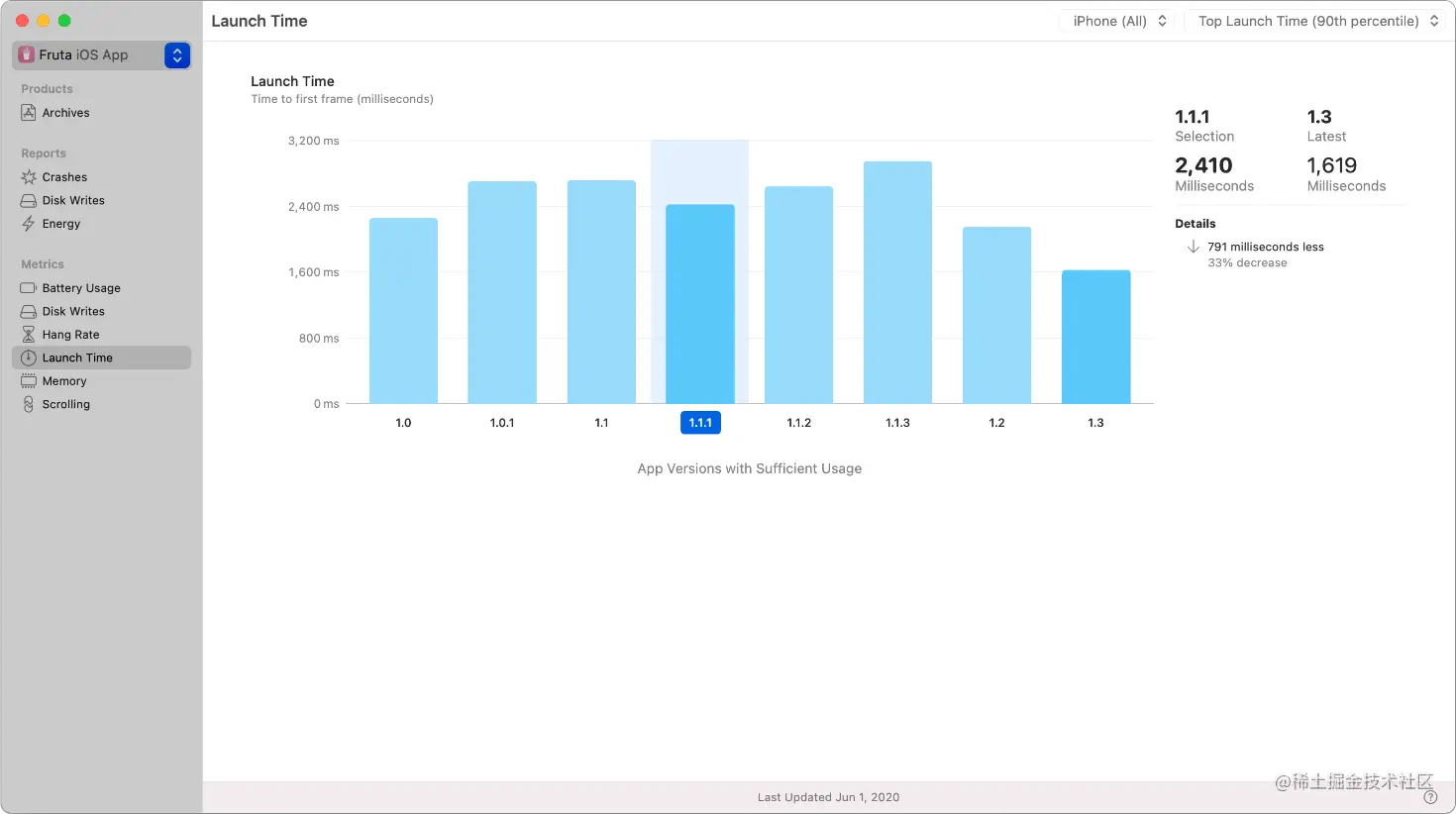 为了更好的评估应用的启动时间,尤其是线上应用的启动时间,我们可以通过打开Xcode的 Window -> Organizer ->Metrics 或者在项目中集成 MetricKit。