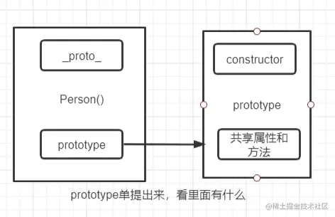 Person()方法里有prototype对象和_proto_属性,prototype上放着constructor和共享属性和方法