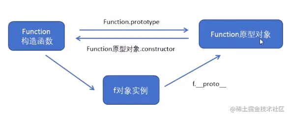 得出结论 javascript 中函数也属于对象,结合前面的构造函数,对象实例,原型对象我们可以画出它的关系图。