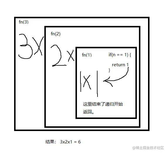 function fn(n){ if(n == 1){ return 1 } return n * fn(n - 1) } console.log(fn(3));