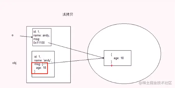 从结果可以看出来,浅拷贝只能拷贝第一层的对象属性和值,对于第二层的对象不是拷贝而是引用(证明:因为当我们尝试修改被原对象的第一次属性 name 时,拷贝的对象的 name 属性没有发生变化,这是因为它们是各自独立的,但是修改第二层的 msg 下面的 age 属性的值时会影响到拷贝对象的 msg 下的 age 的值,因为他们是拷贝的是引用地址)。