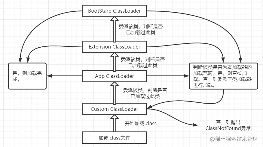 - CustomClassLoader(用户自定义类加载器):由Java实现。我们可以自定义类加载器,并可以加载指定路径下的class文件。