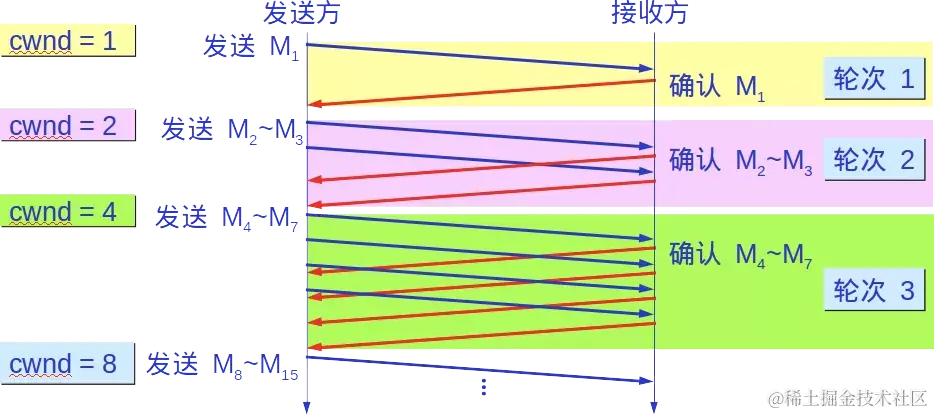 每经过一个传输轮次,拥塞窗口 cwnd 就加倍。一个传输轮次所经历的时间其实就是往返时间RTT。 不过“传输轮次”更加强调:把拥塞窗口cwnd所允许发送的报文段都连续发送出去,并收到了对已发送的最后一个字节的确认。