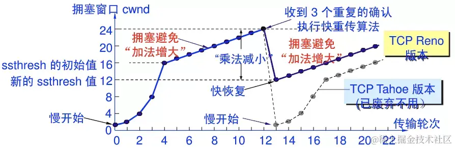 另,慢开始的“慢”并不是指cwnd的增长速率慢,而是指在TCP开始发送报文段时先设置cwnd=1,使得发送方在开始时只发送一个报文段(目的是试探一下网络的拥塞情况),然后再逐渐增大cwnd。