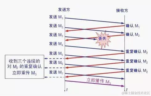 快重传算法还规定,发送方只要一连收到三个重复确认就应当立即重传对方尚未收到的报文段M3,而不必 继续等待M3设置的重传计时器到期。
