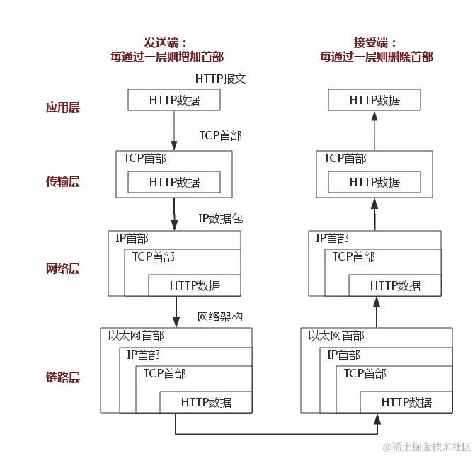 上图清楚地表示了TCP/IP协议中每个层的作用,而TCP/IP协议通信的过程其实就对应着数据入栈与出栈的过程。入栈的过程,数据发送方每层不断地封装首部与尾部,添加一些传输的信息,确保能传输到目的地。出栈的过程,数据接收方每层不断地拆除首部与尾部,得到最终传输的数据。