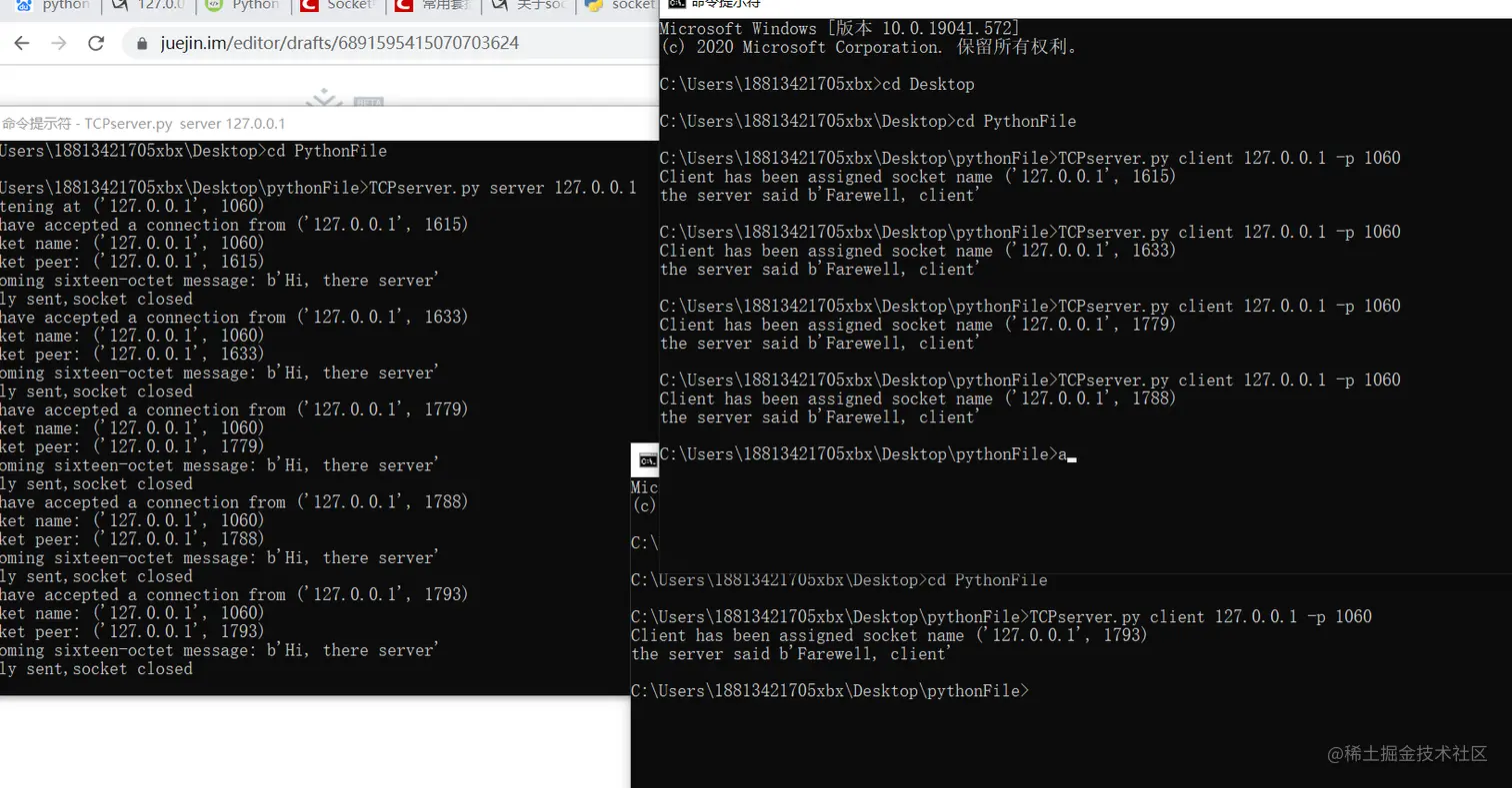 **socket.setsockopt():**第一个参数是即将要设定的套接字选项的级别,可以是IP层,可以是套接字层,这里是SOL_SOCKET代表在套接字层面上对套接字进行设置;第二个参数是SO_REUSEADDR代表允许一个端口在使用完之后马上释放继续使用,因为一个程序如果认为一个TCP对话已经结束的时候,系统的网络栈会把这个会话保持在一个特殊的状态持续一段时间,在这段时间里面,这个TCP会话可以保持正常的对之前与它通信的另一个套接字发送的FIN数据包进行回应,以免FIN数据包丢包而使得TCP客户端没办法关闭,在这个过程里面端口是被占用的,而设置了SO_REUSEADDR参数的套接字会在关闭套接字的时候马上把端口释放出来以供下一次调用,伴随的风险也就是上面说的FIN数据包可能出现丢包的情况导致TCP会话没办法正常关闭。最后一个参数1代表设置数据缓冲区。
