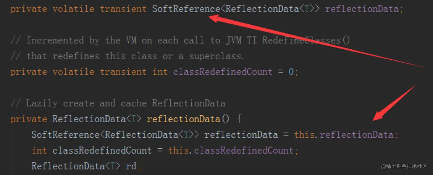 ReflectionData是个内部静态类被缓存起来,里面的属性就是我们做反射操作时需要用的属性Field,方法Method和构造函数等。但是有个问题reflectionData是被SoftReference软引用修饰的,如下图