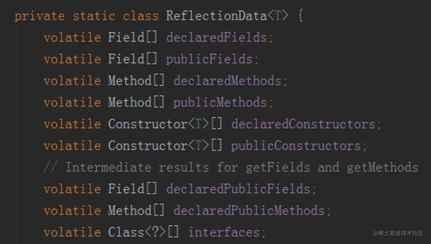 继续跟代码可以看到这些反射的实现都会用到java.lang.Class里的ReflectionData对象
