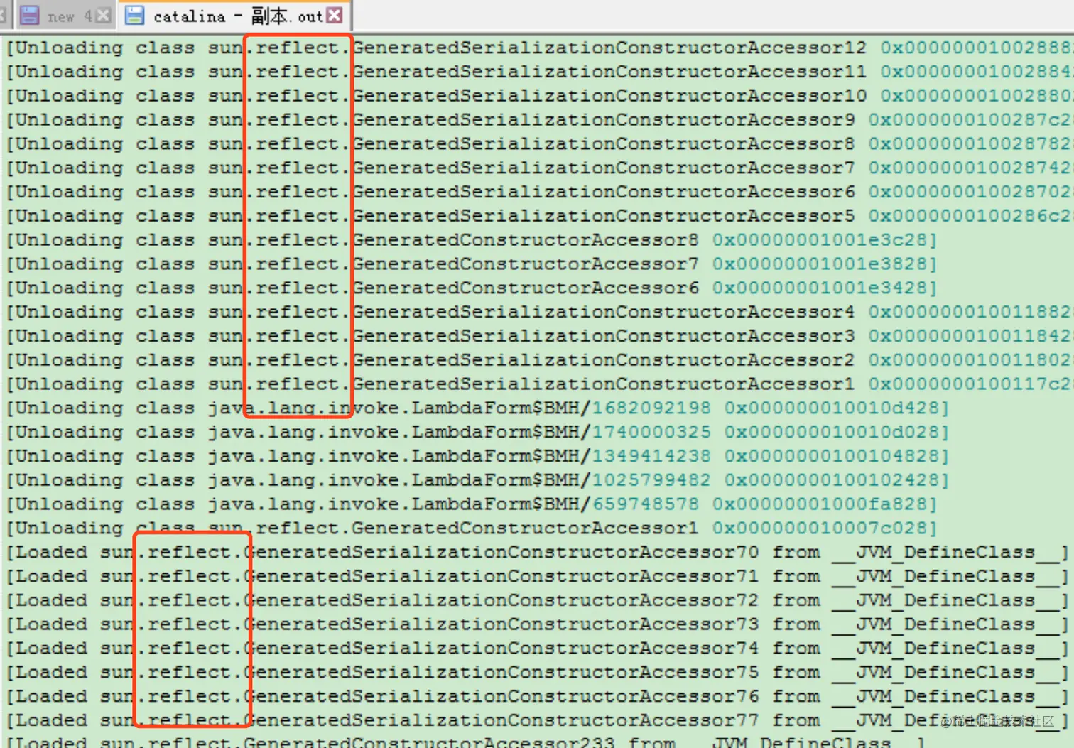 这里我在测试环境Java应用的jvm里增加-XX:+TraceClassLoading -XX:+TraceClassUnloading记录下类的加载和卸载情况,然后通过jmeter多个线程调用订单详情接口模拟metaspace溢出的现象,发现在catalina.out文件里输出的除了业务上用到的类外还有大量的反射类,如下: