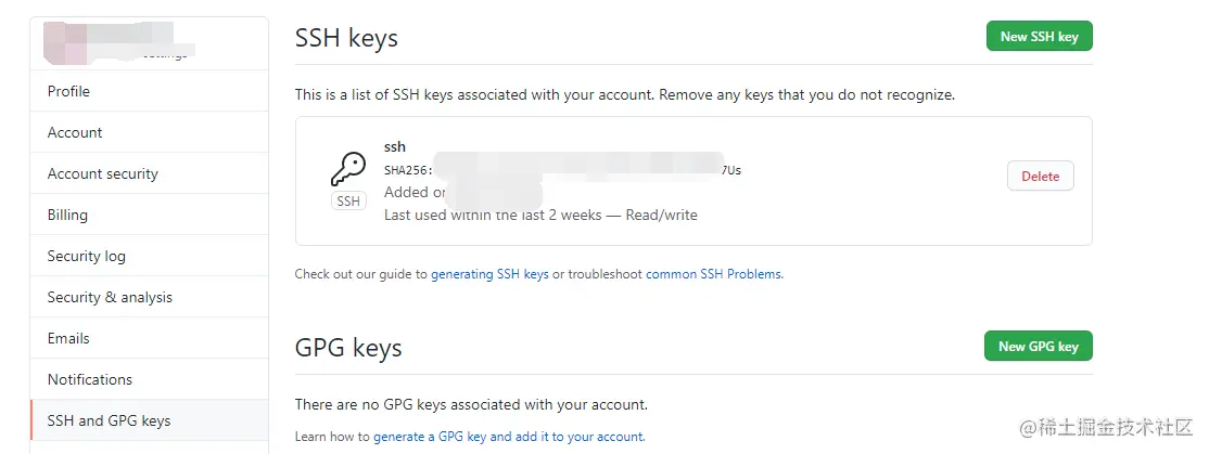 (4)接着复制id_rsa_pub文件里面的所有内容。打开github,进入settings,选择左边的SSH and GPG keys,把刚才复制的密钥添加进去,title那里可以自己决定起一个名字,点击添加,最后就可以看到生成sshkey了。下次上传项目时就不需要再配置密钥了。