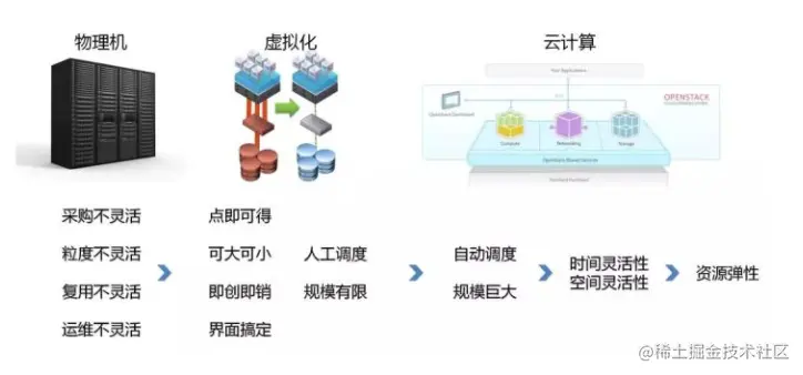 后面各大服务器厂商为了让其灵活好用,在物理机上虚拟化了,通过人工配置的方式方便虚拟出你需要的资源环境,不过规模也是有限的,后面在虚拟机的基础上最终实现了云计算,环境都统一部署到一个数据中心,再通过互联网给客户灵活的提供计算资源,网络资源、存储资源。