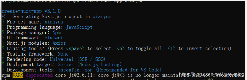 需要等待安装依赖的下载,下载完成后可以看到下面的提示框,要求输入项目名称和其他一些问题