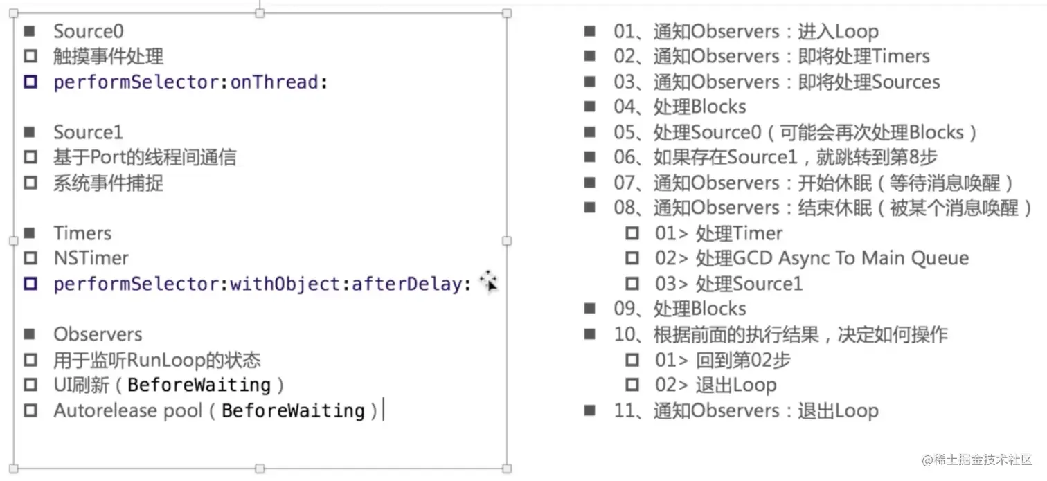 1,RunLoop作用,保证程序一直在运行中,处理 APP 中各种事件(比如触摸事件,定时器事件),节省 CPU 资源,提高程序性能:该做事做事,该休息休息