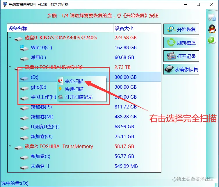 步骤1:软件打开后,右击需要恢复的盘选择完全扫描(不要直接点开始恢复,默认是快速扫描,格式化的盘需要完全扫描数据才完整)。