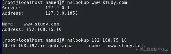 做好了以上配置以后,在本机使用bind-utils提供的nslookup工具检验是否搭建成功。