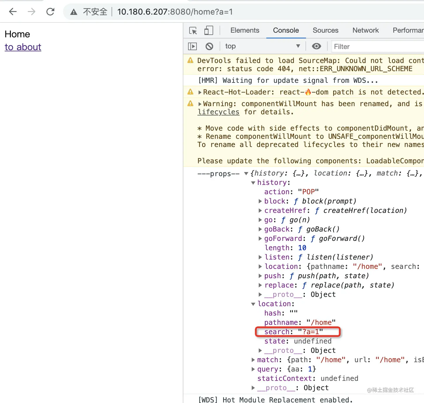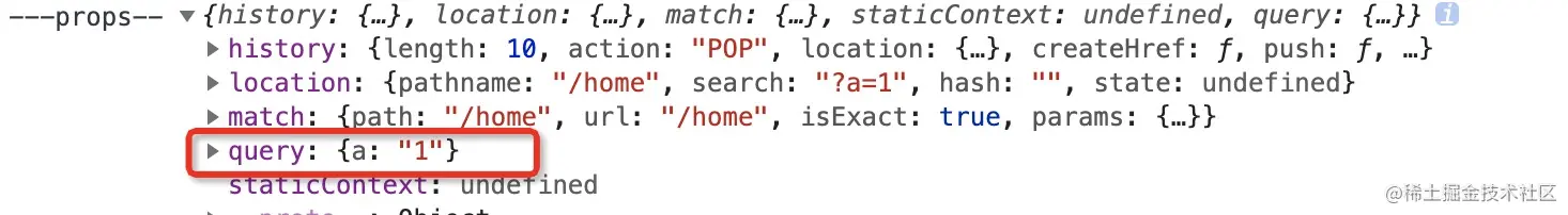 页面中也能通过props直接获取query,而不需要每次都解析url参数一遍, Home或者About的props可打印出