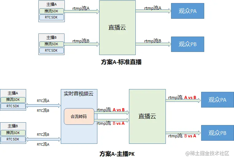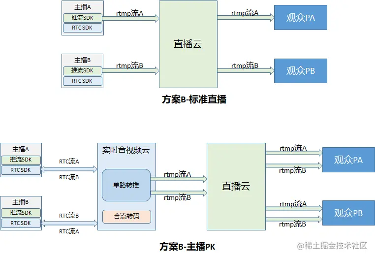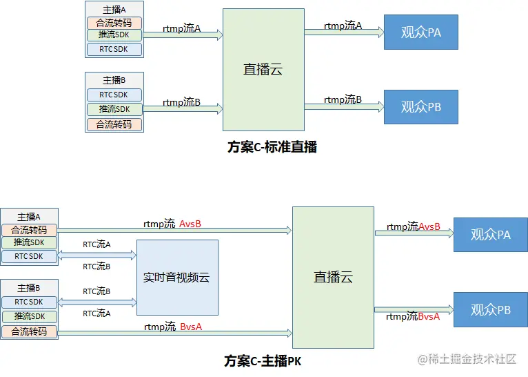 这是一种最常见的实现方式,标准直播使用推流 SDK,切换成 PK 模式的话,走的是连麦及合流转码服务。其他方案的优缺点主要都基于与这一方案进行比较。