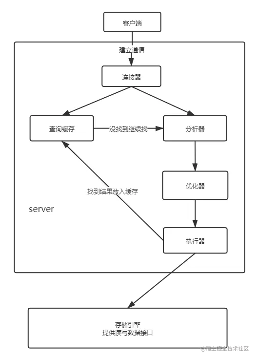 - 最后,进入到执行器,首先会判断你是否有权限,没有直接返回没权限的错误,有的话将会使用存储引擎的接口。等到之后如果有设置缓存,需要将结果返回到缓存中。