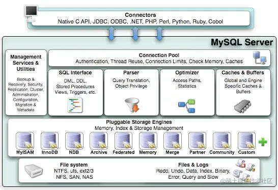 存储引擎就是我们的数据真正存放的地方,在 MySQL 里面支持不同的存储引擎。 再往下就是文件管理系统,内存或者磁盘。