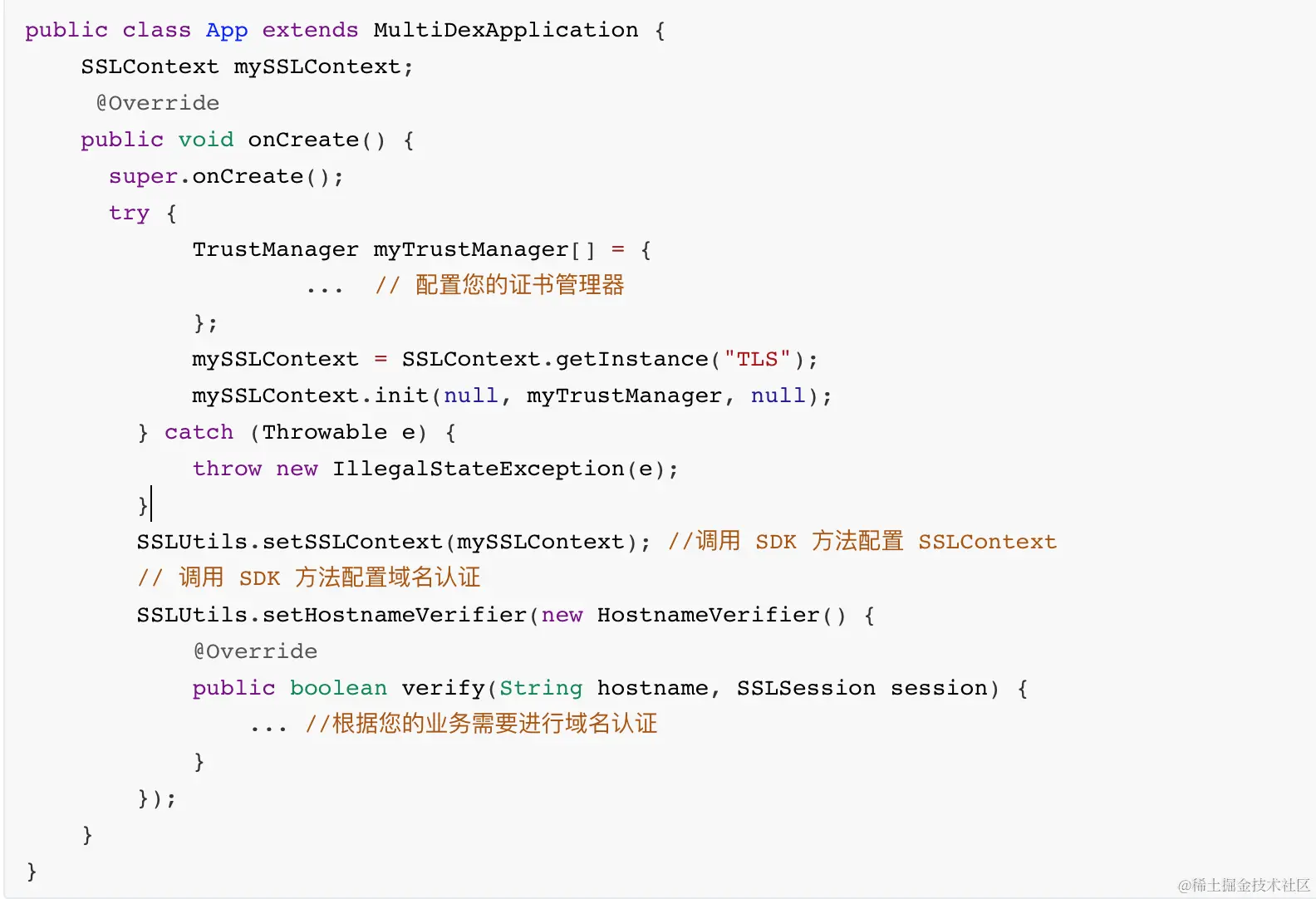 配置融云SDK的自签证书 乌兹 2020-11-06 132 阅读1分钟 由于在Google 商店将应用下架的原因,查询具体原因是由于融云SDK 的自签证书导致的,所以联系融云才知道融云已经针对此问题进行了优化,可以升级到SDK 2.10.6 版本及以上的版本即可解决此问题,但是问题又来了,若是需要配置自签证书,该怎么办 呢? 以下就我的项目中的配置整理出来,供大家参考: 在应用的 onCreate() 方法里参考如下伪代码进行配置: