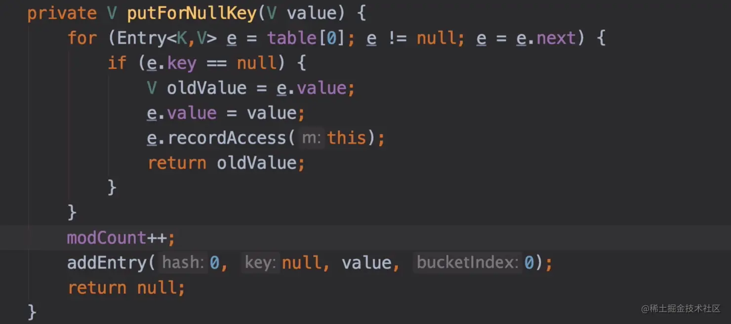 - 遍历数组中的第一个元素,对这个元素(链表)遍历,如果找到了key==null的就返回该元素的value