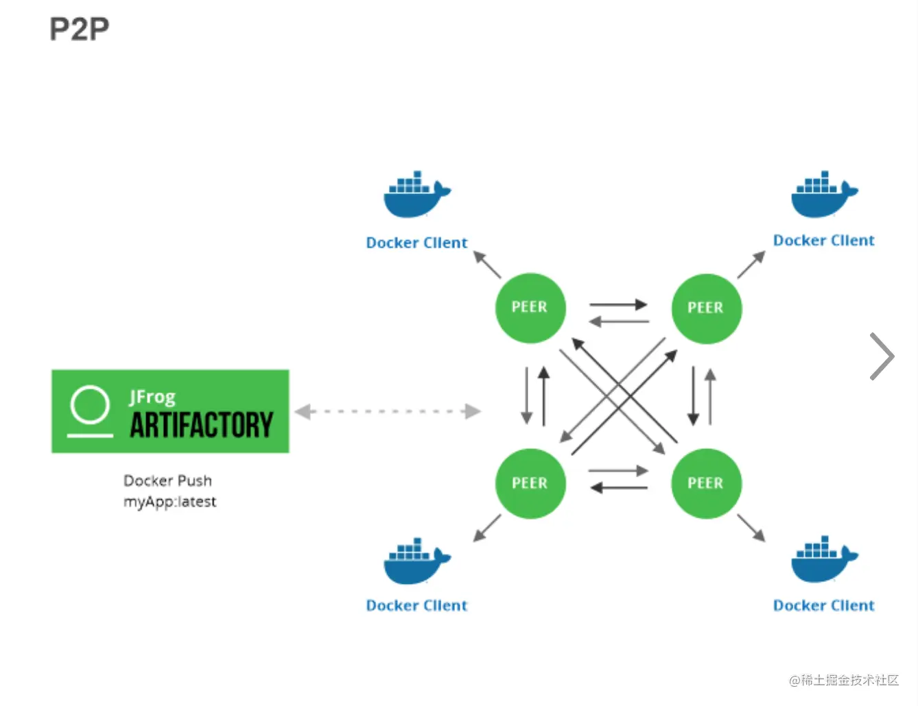 l P2P Swarm: 是一个peers 节点的逻辑集合,它形成了分布式的网络,用于给集群内的 Docker 客户端共享制品。